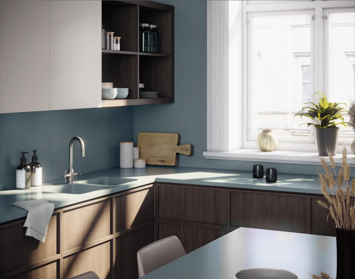 A deep, modern blue that simulates the balance between the depth and the surface of the sea when interacting with light.