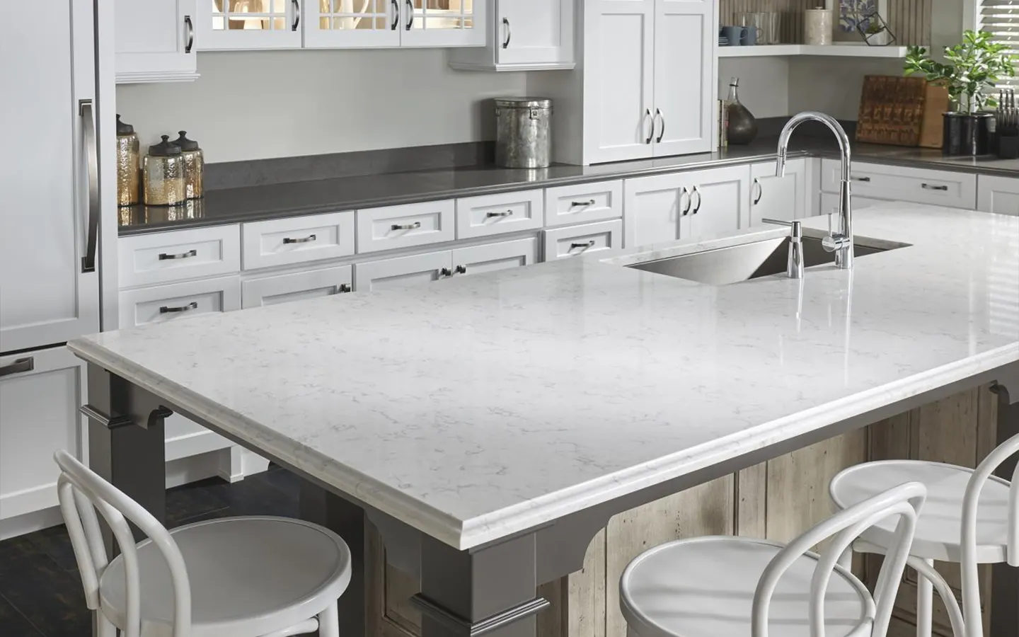 Alabaster with grey marbling gives a rich and luxurious feel. The perfect harmony of colors is reminiscent of the marriage of notes in a minuet.