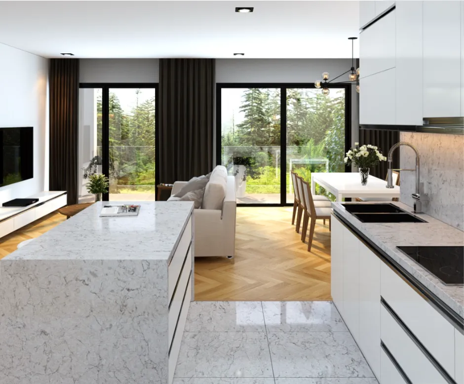 Argento combines gray and brown veins spreading freely on a granite-look background. Featuring a touch of sparkle throughout the slab.