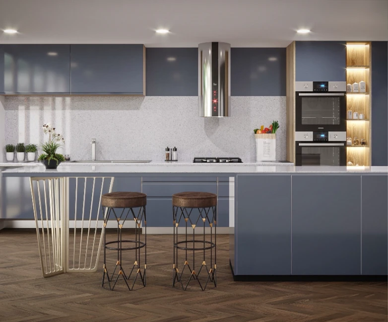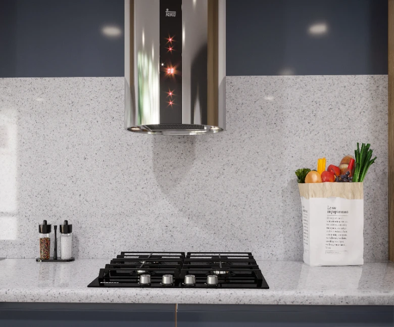 Castelo features large quartz particles that look like glass fragments. The transparent particles provide a depth.